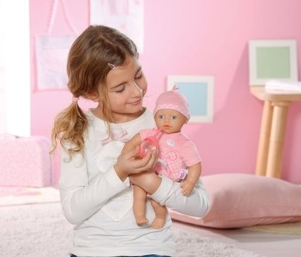 Super leuke My Little Baby Born Pop Roze! Leg haar in haar bedje, geef haar het flesje en knuffel met deze lieve babypop. De pop heeft een mooie roze pyjama aan en een mutsje op. Inclusief flesje.