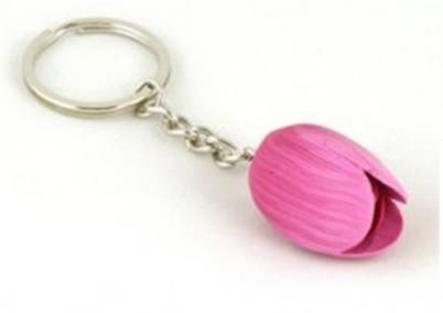 Een tashanger met een roze tulp eraan, helemaal hip!