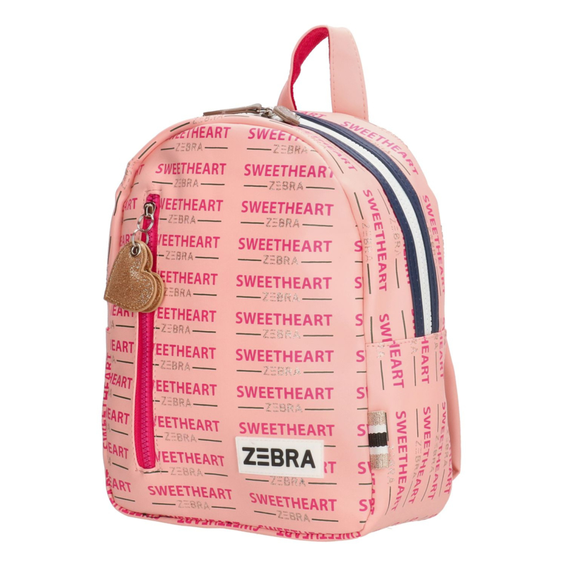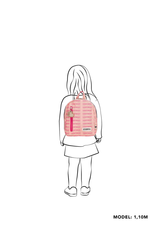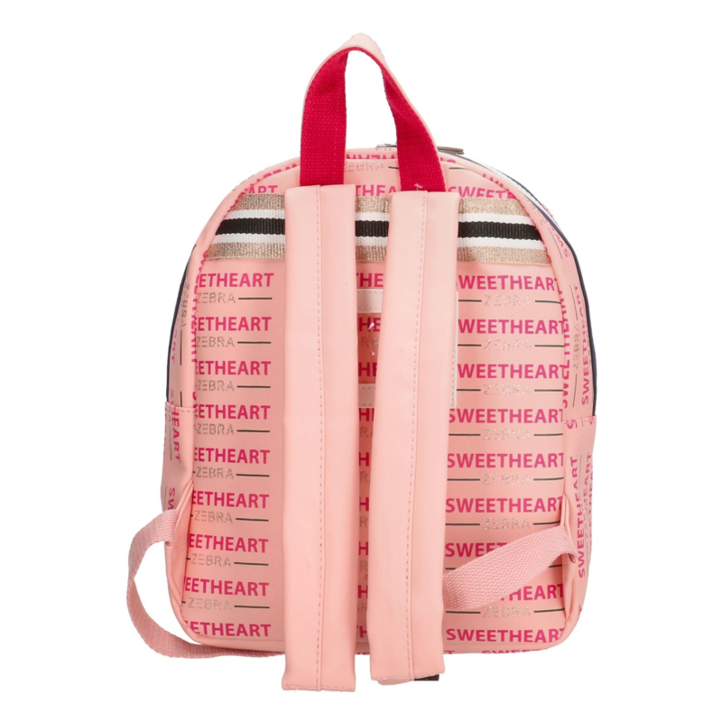 Are you my sweetheart? Het favoriete roze van de meisjes in een nieuw jasje! Afgewerkt met details van glittergoud. De gehele PU tas sluit dmv een stevige zwart-witte blokrits met dubbele sluiting en voorop zit een knalroze verticale rits als extra opbergvak, afgewerkt met 2 hartjes. De tas is te dragen dmv het korte hengsel bovenop en de lichtroze verstelbare schouderbanden. Binnenin zit een gestreepte voering en bevinden zich 2 drinkbekervakken. Achterop het handige naamlabel.