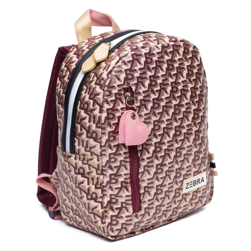 Hot & happening… logoprints. Bij Zebra ook nog eens extra versierd met subtiele gouden glitters. Lichtroze met donkerrode kleurcombinatie. Voorop zit een verticale donkerrode rits afgewerkt met lichtroze glitterhartjes, die dient als extra opbergvak. De gehele tas heeft een stevige zwart-witte blokrits met dubbele sluiting. De tas is te dragen dmv het korte hengsel bovenop en de verstelbare schouderbanden gemaakt voor donkerrood kunstleer. Binnenin bevinden zich 2 drinkbekervakken en een vrolijke lichtroze gestreepte voering. Achterop het handige naamlabel.